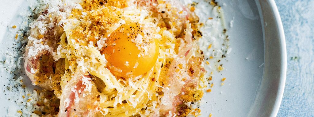 - Formez un nid de pâtes dans une assiette, placez un jaune d'œuf au centre, ajoutez le guanciale et saupoudrez de Grana Padano râpé. Terminez par un tour de moulin à poivre avant de servir.