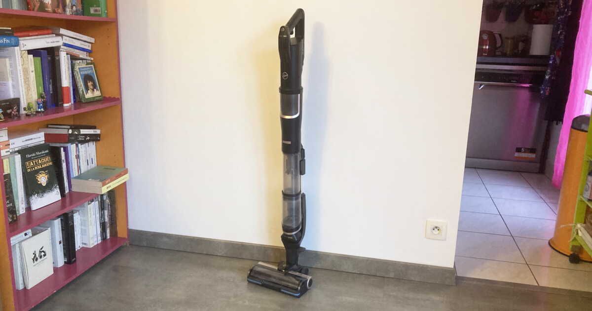 brosse motorisée qui permet le nettoyage de divers types de sols. Il se distingue également par sa position de parking, qui lui permet de rester stable debout sans support, pratique pour les petites pauses nettoyage. En outre, l’imposante brosse motorisée peut être retirée sans se baisser, grâce à une pédale. Cependant, un petit clic rassurant serait bienvenu lors de ses connexions.