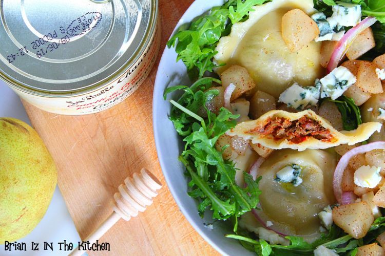 - Assembler le plat : Disposez 3 ravioles par assiette. Ajoutez les poires caramélisées, des morceaux de roquefort et des oignons rouges finement ciselés.
