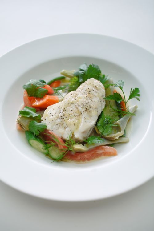 Réchauffez les légumes dans cette sauce juste avant de servir. Disposez le pavé de cabillaud au centre d'une assiette creuse, entourez-le des légumes, ajoutez des pétales de tomates séchées et des herbes fraîches.