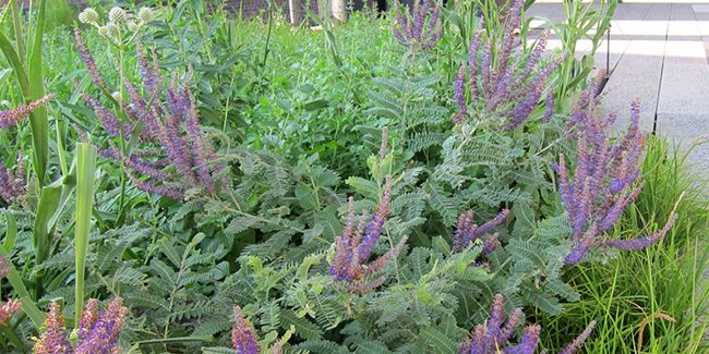 Originaire des terres sèches d'Amérique du Nord, le Faux indigo (Amorpha canescens) s'est introduit en Europe au XVIIIe siècle, notamment durant les conquêtes militaires. Cette plante robuste, capable de résister à des températures aussi basses que -20°C, se développe rapidement et peut parfois ses montrer envahissante. Sa profonde racine pivotante facilite la stabilisation des sols tout en rendant son arrachage délicat.