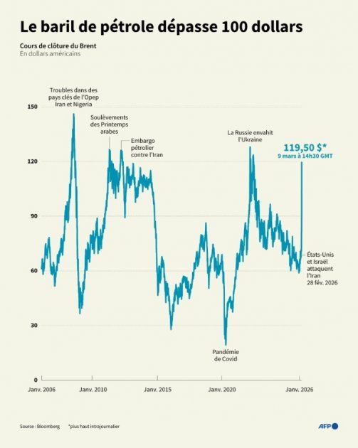 Cette dynamique contraste fortement avec la panique qui a précédé l'ouverture : les marchés avaient connu une montée inédite, avec le Brent atteignant 119,50 dollars et le WTI 119,48 dollars en début de session.